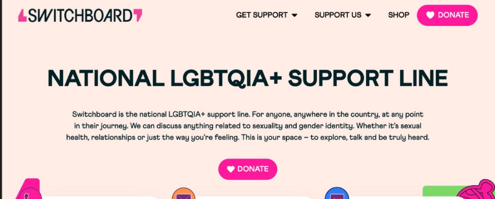 For Switchboard, a key focus was the visual identity of the website and paying homage to the LGBTQIA+ community. GRM Digital created the website with this central motif at the forefront of its design, including the dynamic colour pairing paying tribute to the LGBTQIA+ flag.